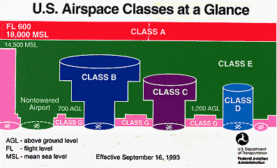 This is a complex definition because it covers the rest of the airspace not designated in above Classes. If it is Controlled Airspace, and it is not A, B, C, or D, then it is Class "E". All of the Airways (the "V Routes") are in this airspace. Unless otherwise designated, like the "V Routes" for example, it commences at 14,500 feet and extends up to 18,000 feet.