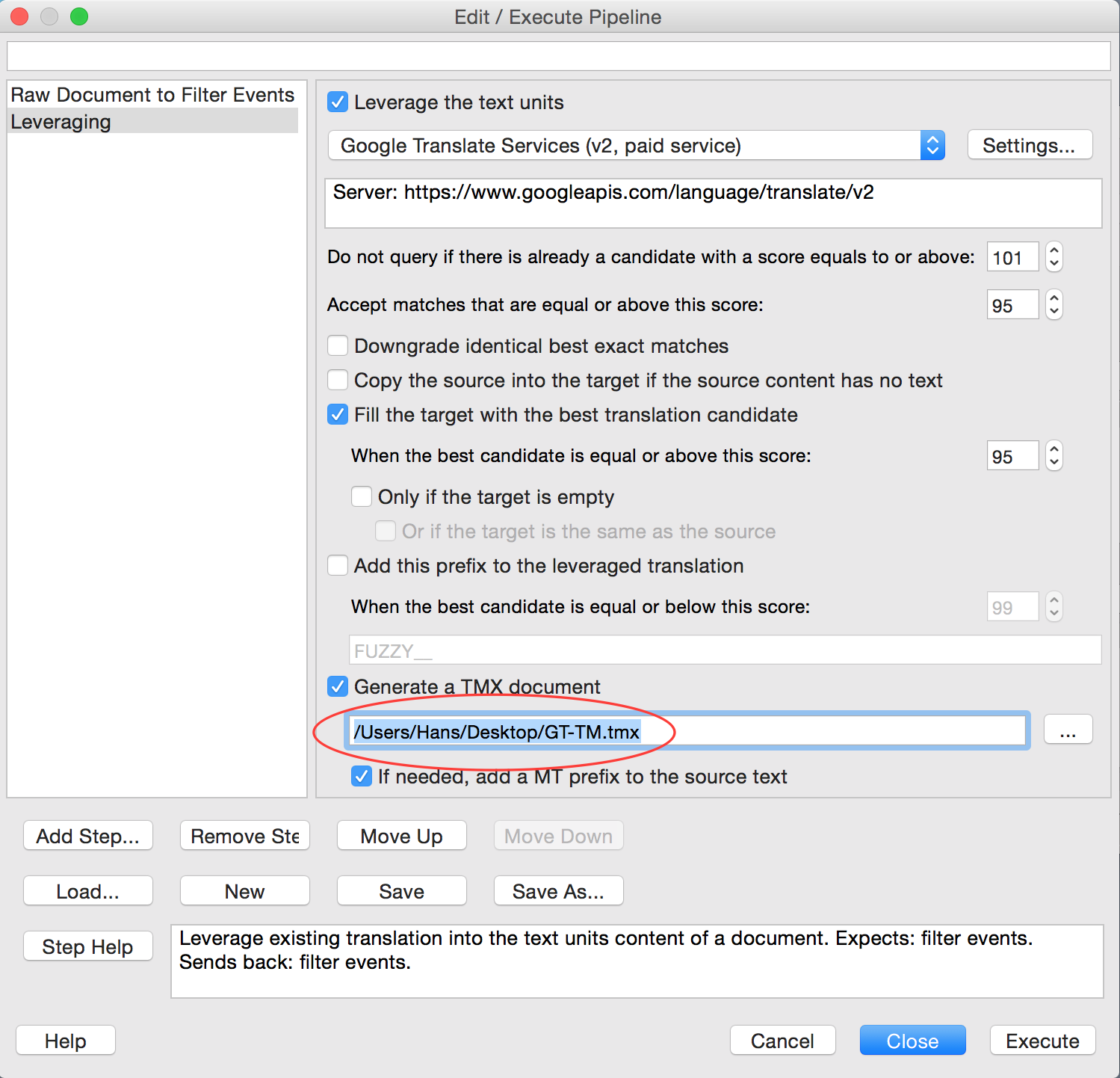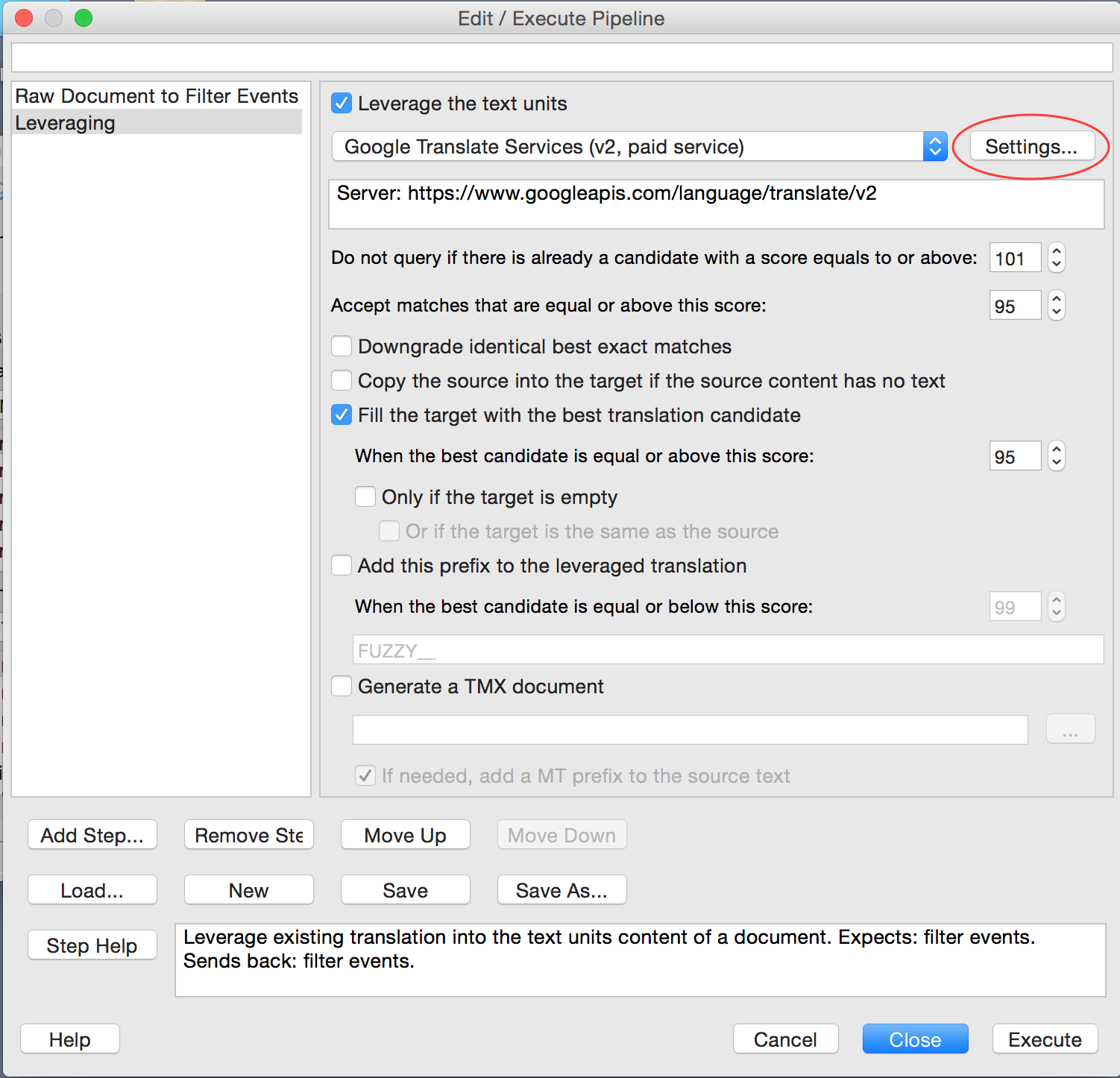 - Then ad the Leveraging step - here you define the TM or MT engine, it can be Google Translate, there are also other options: