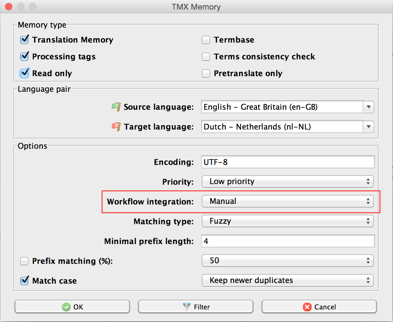 - To prevent automatic insertion of unchecked matches from the Google Translate TM set the Workflow integration for the TM to Manual matching: