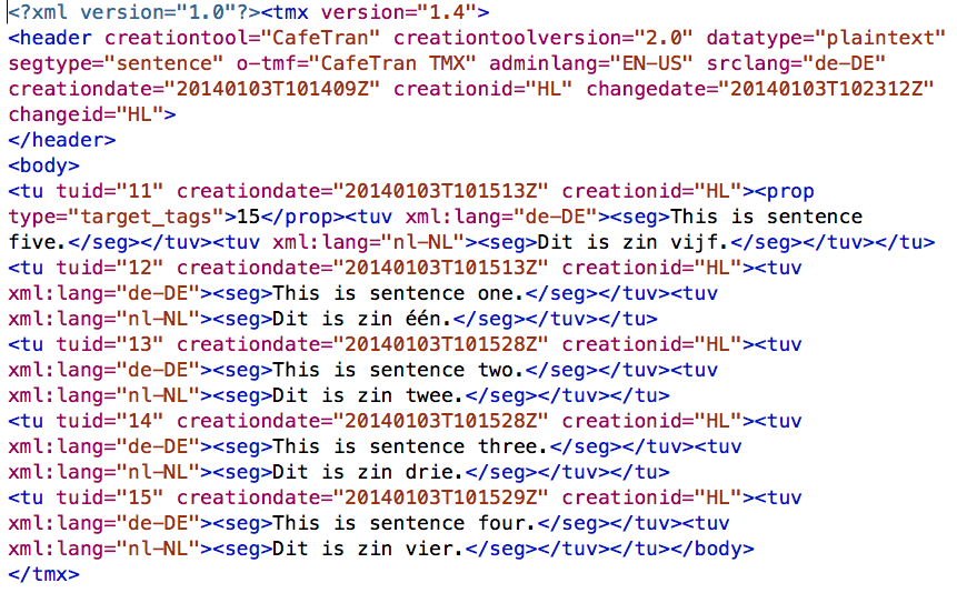 - Make sure that you do not remove the closing tags </body> and </tmx>.