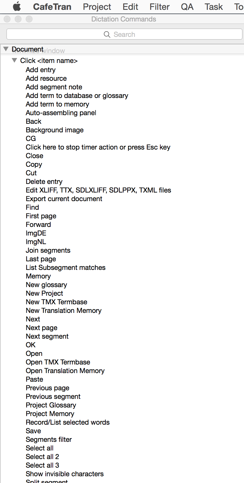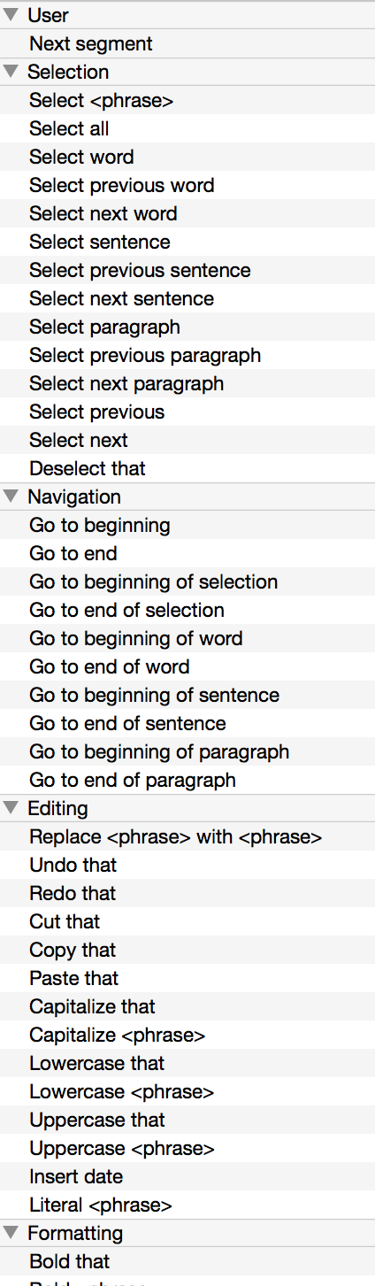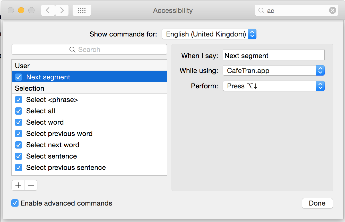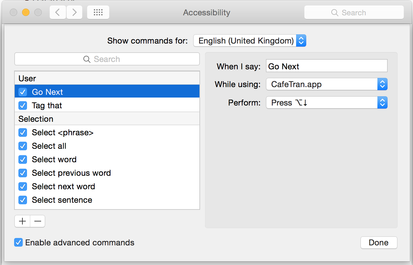 In order to be able to navigate to the next segment and to insert tags via speech recognition, open System Preferences > Accessibility > Dictation. You will have to add two extra commands: