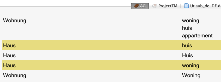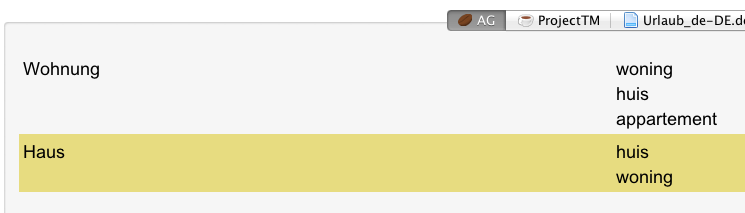 While this glossary is loaded and its tab is active in the tabbed pane, select Library > Glossary > Merge alternative translations to optimise the glossary. The old glossary is saved and the new, optimised glossary is loaded and displayed: