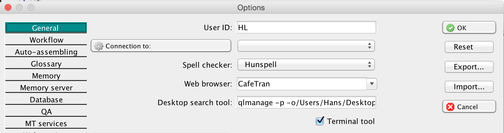 • In the Options dialogue box click on the Reset button to reset CafeTran to its factory settings: