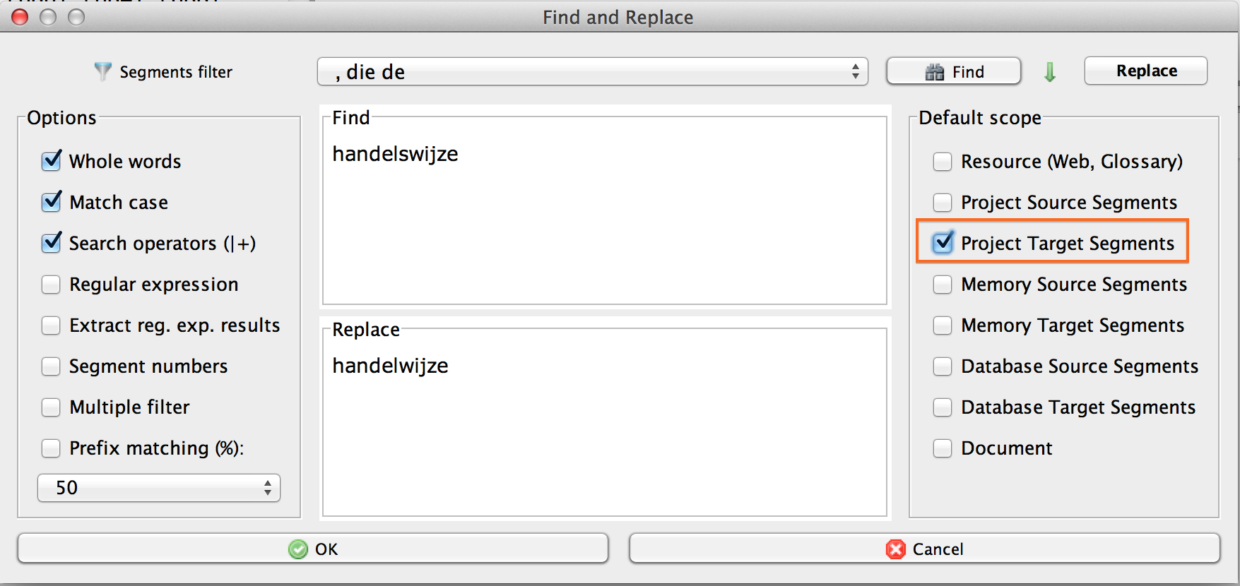 A special situation exists, where you have to deal with client TMs that are not up to standard. CafeTran offers some handy features to correct these legacy TMs. First use find and replace to make the necessary correction in your current project: