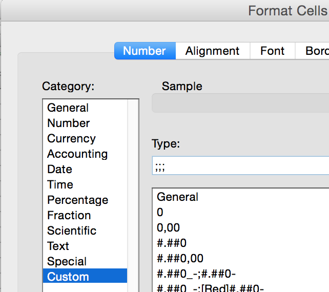 - In the Format cells dialogue box of Excel create a Custom cell format with content ‘;;;’ (that is three consecutive semicolons):