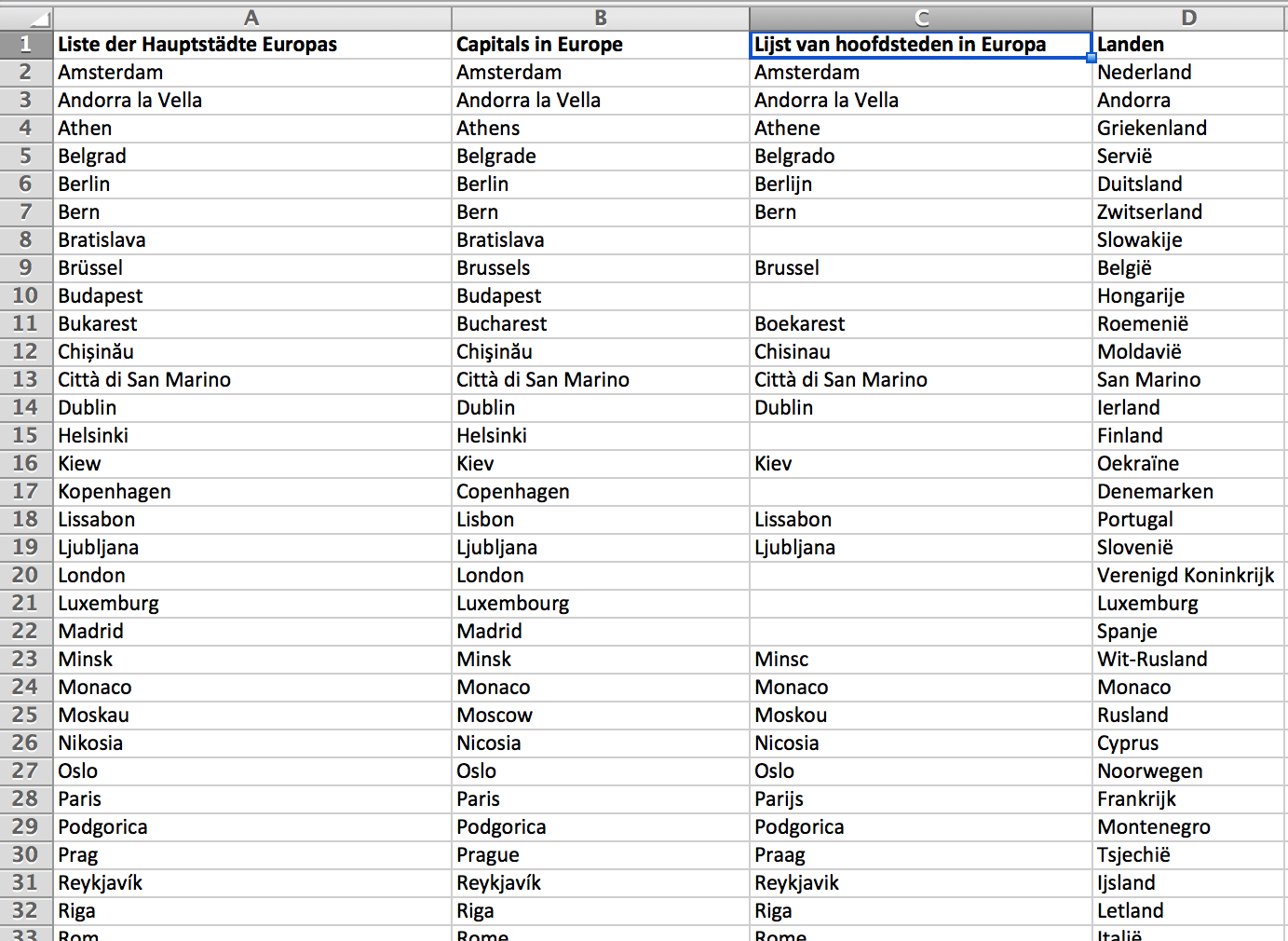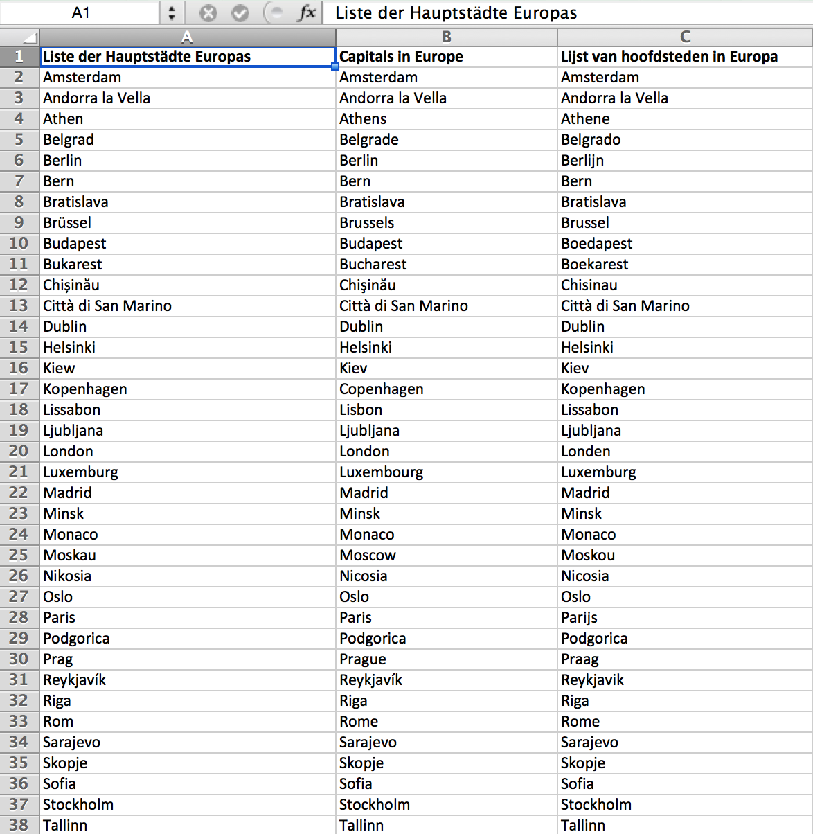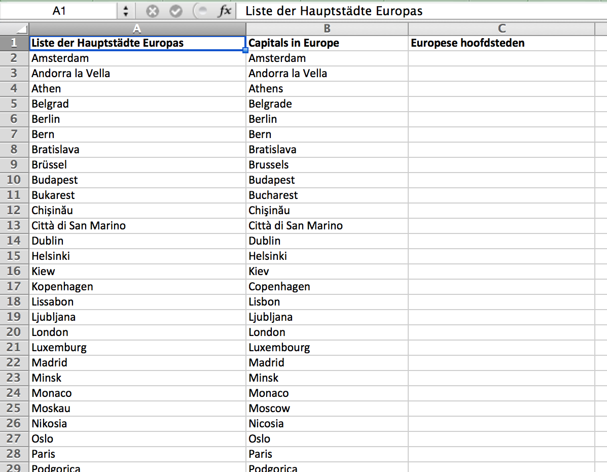 Here is an example of a multilingual Excel worksheet. Your task is to insert the translation of the first column into the third column: