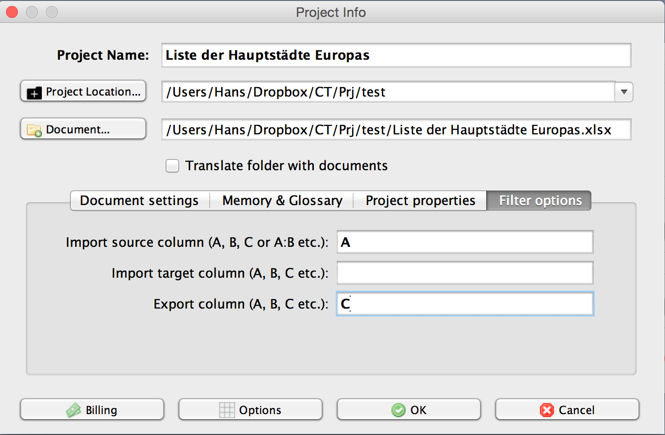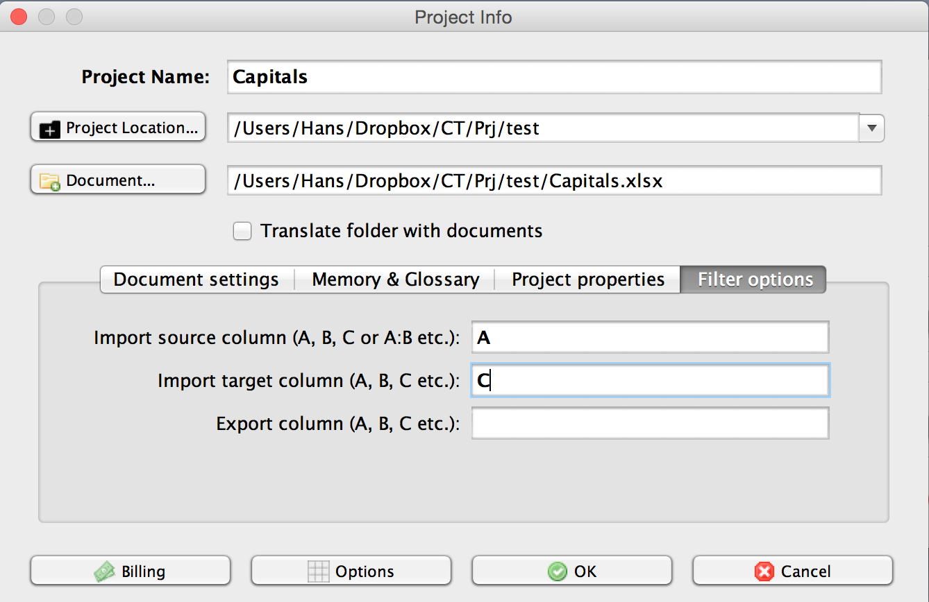 - On the Filter options tab insert the letter for the column containing the source language into the field Import source column.