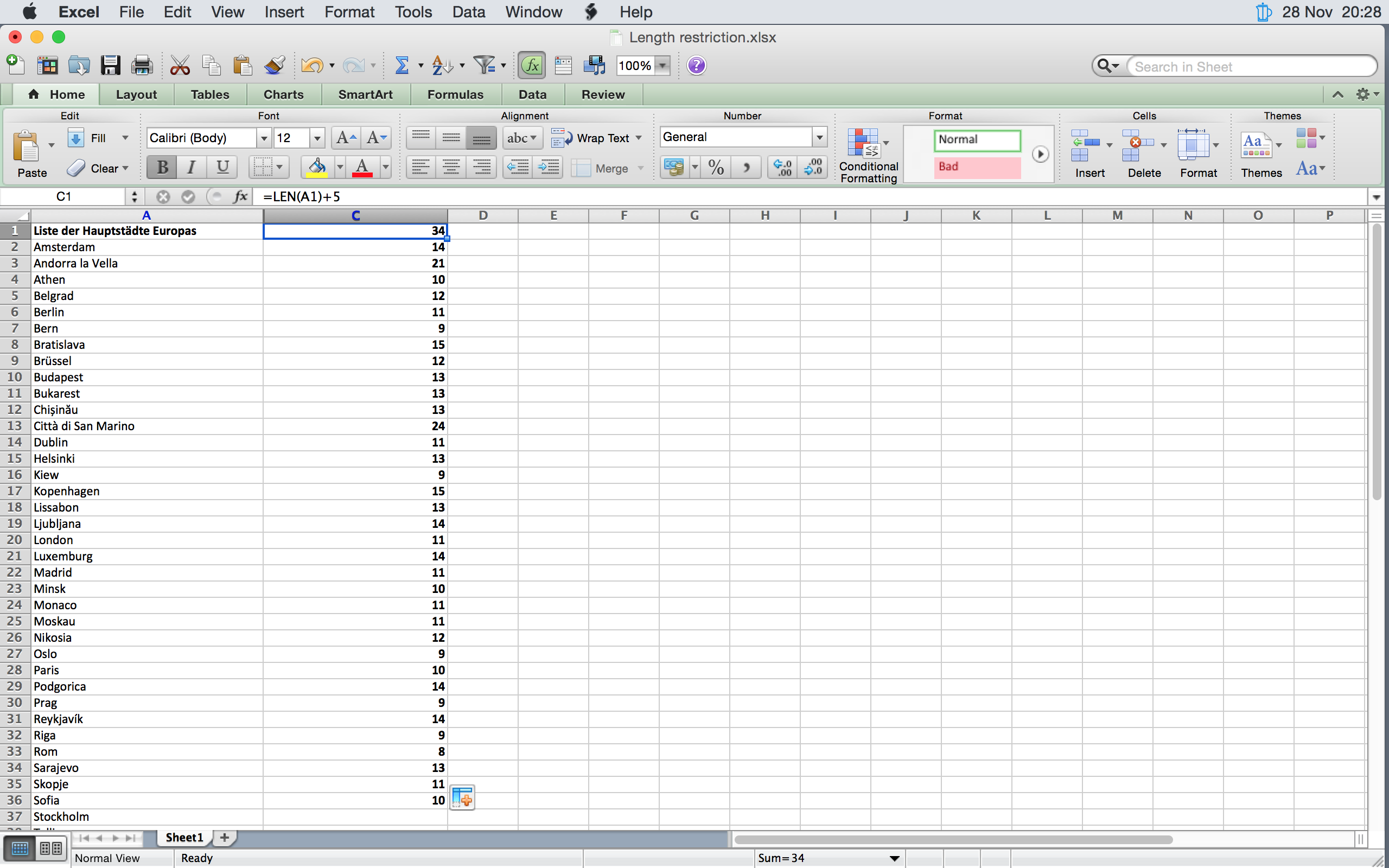 Length restrictions for translations of GUI strings come in different flavours. One possible variant is to limit the length of the target term to the length of the source term plus a number of extra characters (n=5). In Excel you can use the formula =LEN(A1)+5 for this: