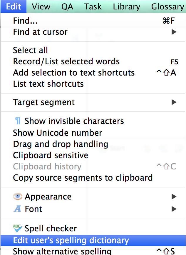 - Choose Edit > Edit user's spelling dictionary: