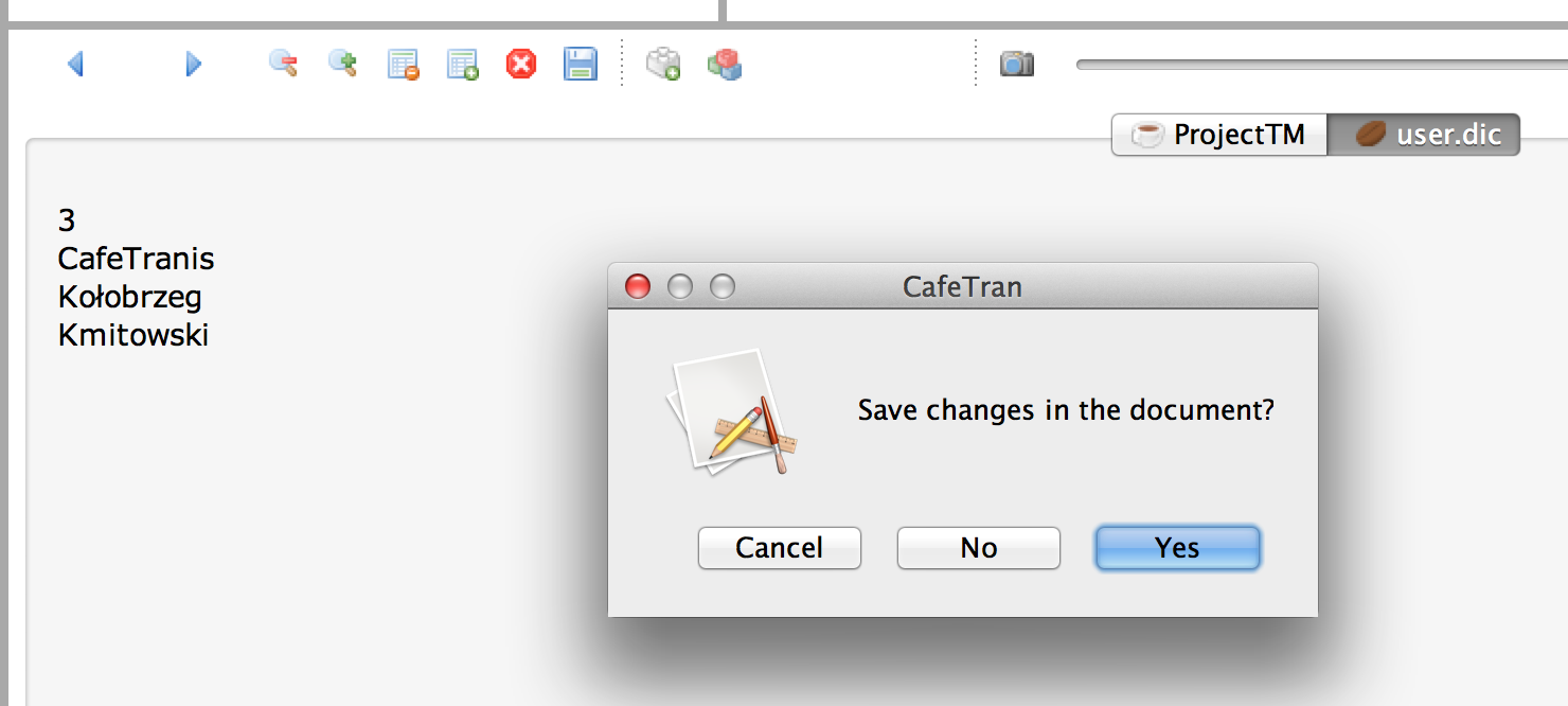 - Click on the white ⊗ in a red circle to close the edited user.dic and save your private spelling dictionary: