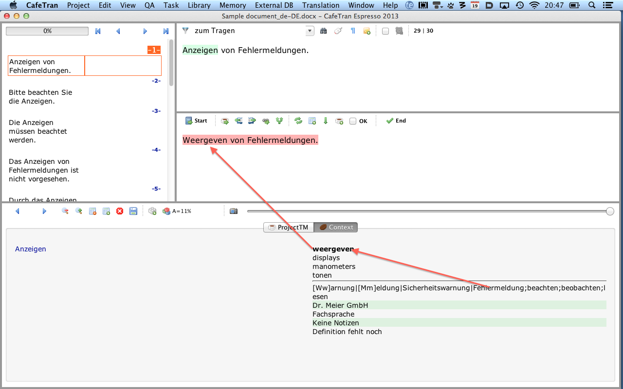 Example 1: The source segment contains 'Fehlermeldungen', which is the plural of 'Fehlermeldung', which is present in the context field as a trigger for the target term 'weergeven'. In other words: since the source segment contains both 'Fehlermeldung' and 'Anzeigen', the target term 'weergeven' is inserted.