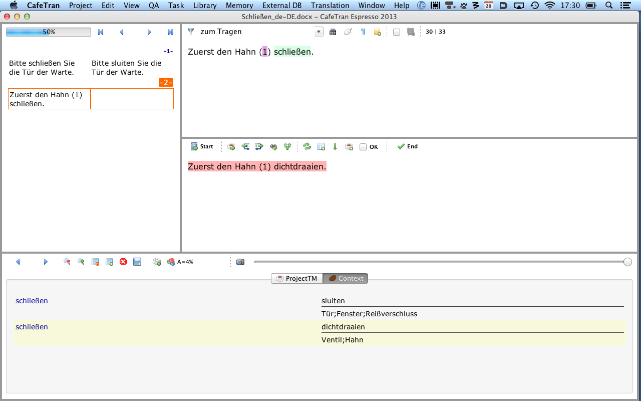 The German verb ‘sichern’ gets different translations (borgen, back-uppen, zekeren, beveiligen/beschermen, …) into Dutch, depending on its meaning. For a CAT tool like CafeTran, there currently is no way to determine the meaning of a word. However, it can determine the context of a word at the surface level. When a word occurs in the context of certain other words (e.g. Schraubverbinding/Bolzen/Schraube, Daten/Datensatz/Diskette, Bergsteiger/Kletterer), this can give a cue about its meaning. So paying attention to a word’s context is a good way to narrow down the possible meanings of a word. This is where CafeTran’s Context-aware Auto-assembling can help you to be more productive.