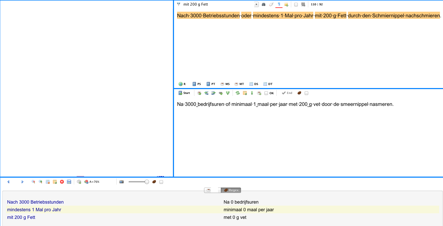 CafeTran recognises the glossary entries and inserts the correct numbers at target side.