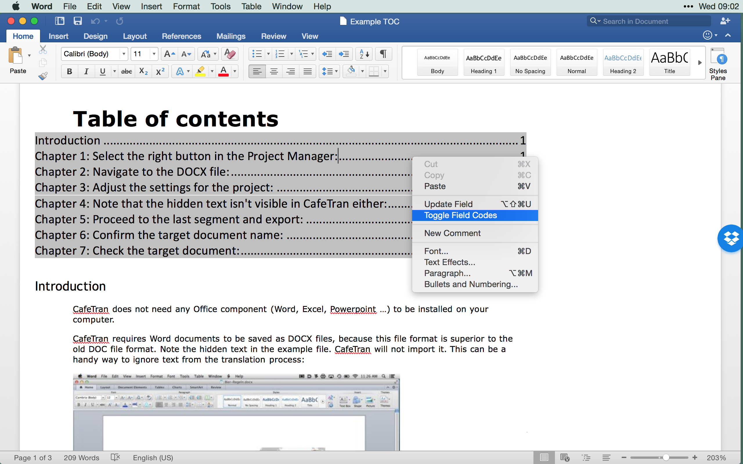 This is how a Word document with an automatically generated table of contents looks in CafeTran: