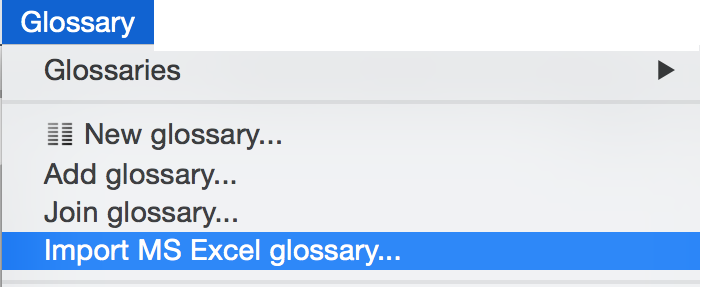- From the Glossary menu choose Import MS Excel glossary: