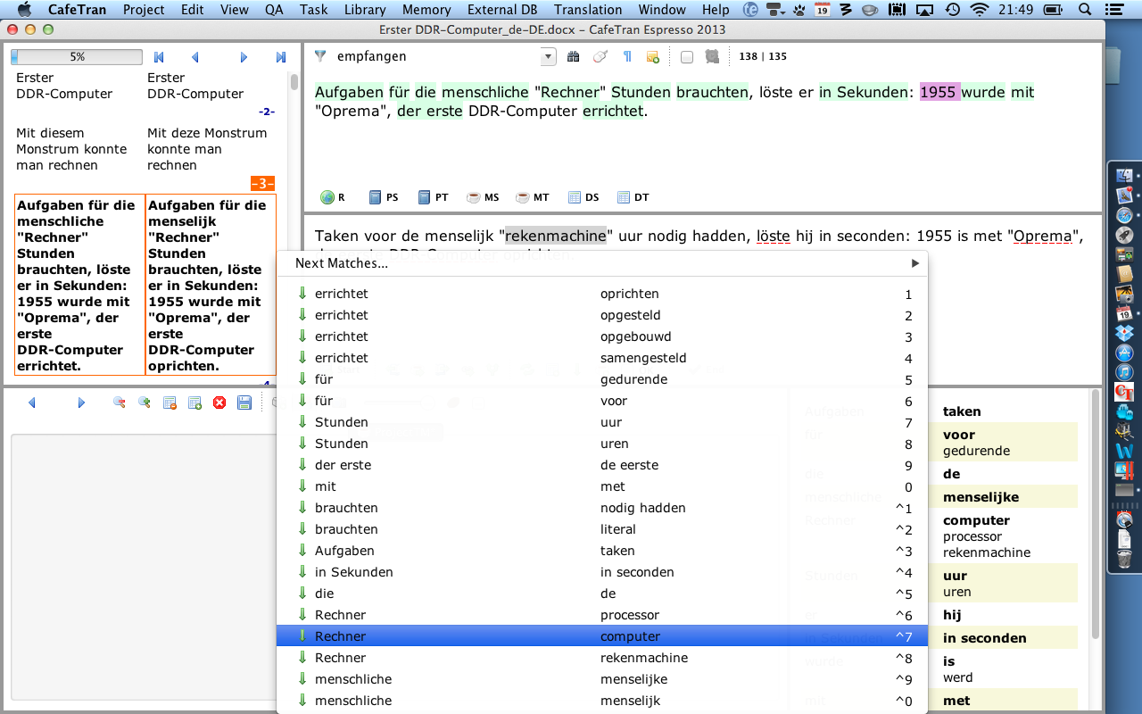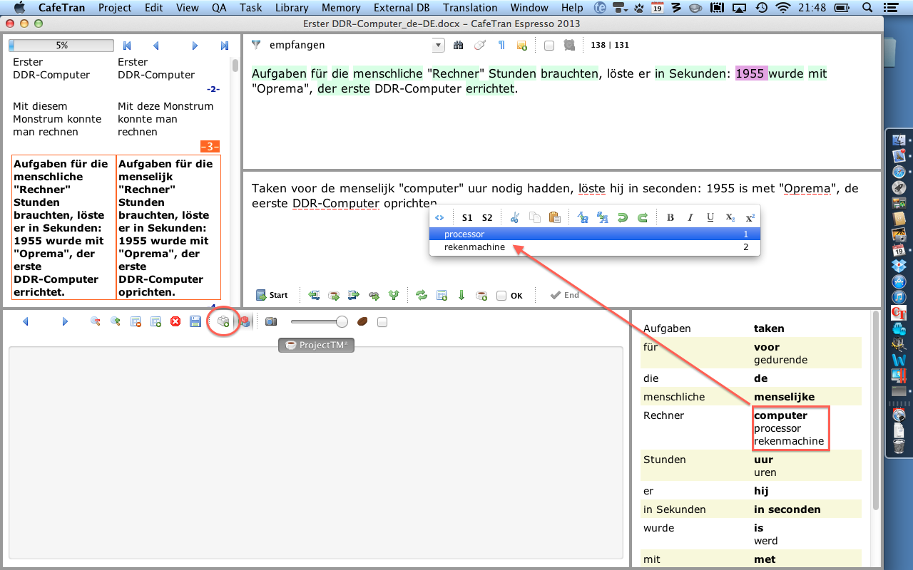 In longish target segments for which the translation has been auto-assembled nearly perfectly, you can click on the one word that needs to be replaced and directly insert the correct target term. Two clicks and your segment translation is perfect. Reread the target segment and proceed to the next segment.