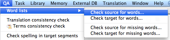 Choosing from the menu QA | Word lists | Check source or target for words… will filter out those segments that contain any of the words listed in a text file.