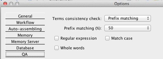 Checking in the Match case option in the QA tab will make the program perform case-sensitive filtering while with the Whole words option ticked, CafeTran will match only whole words in segments if they are present in the list.