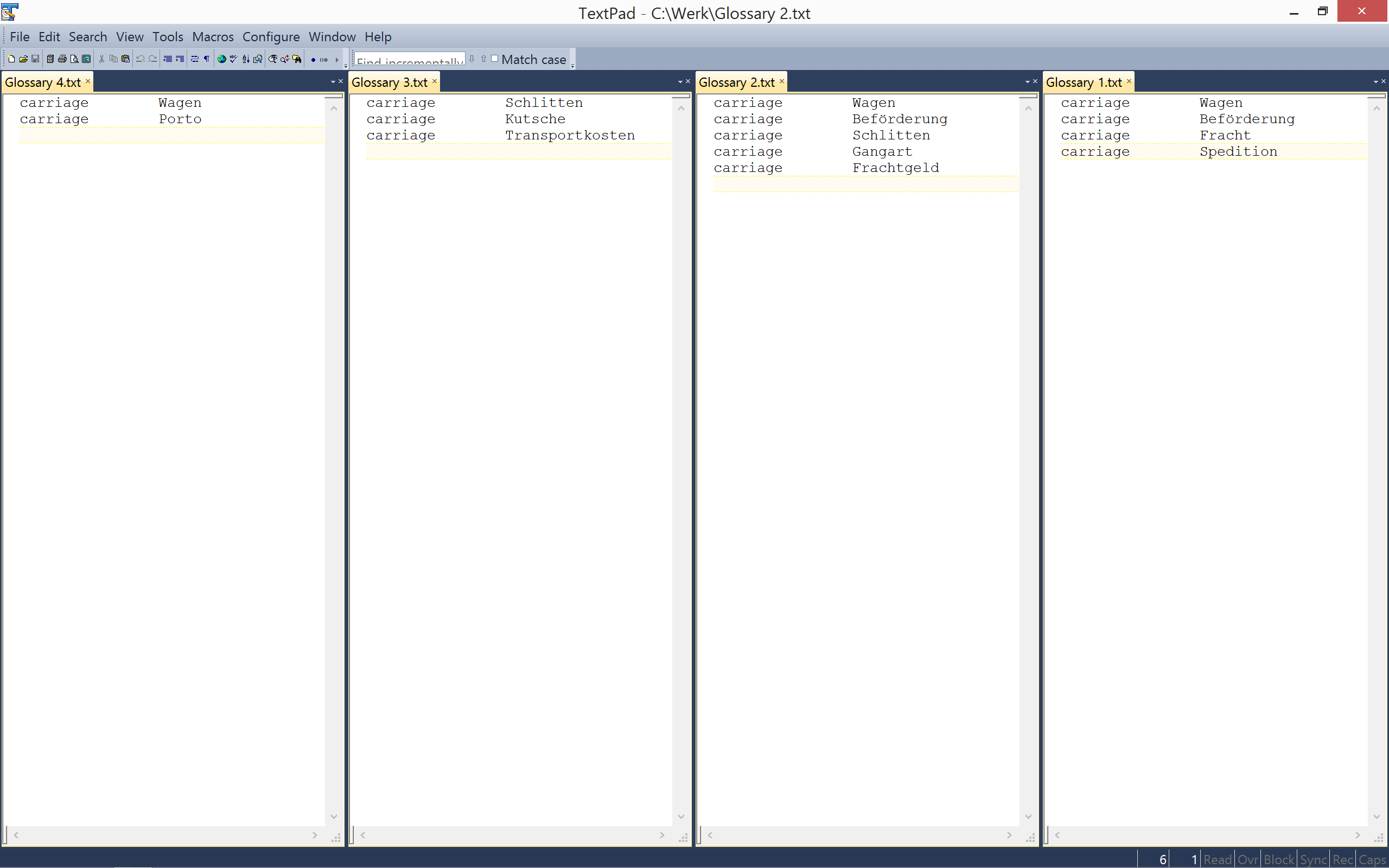 Here are four different glossaries opened as tab-delimited text files in TextPad: