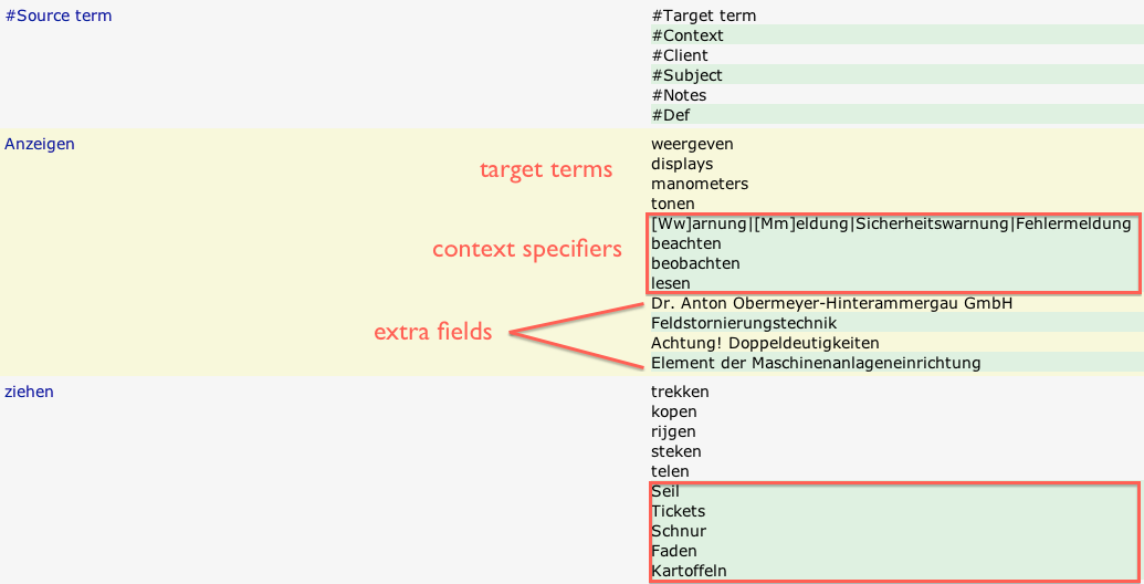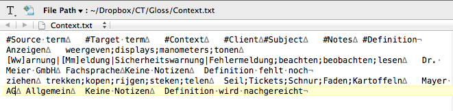 Let's have a look at the glossary file. Here, several target terms are combined in one row (record). They are separated by a semicolon. The Context field represents the third field of the glossary text file: