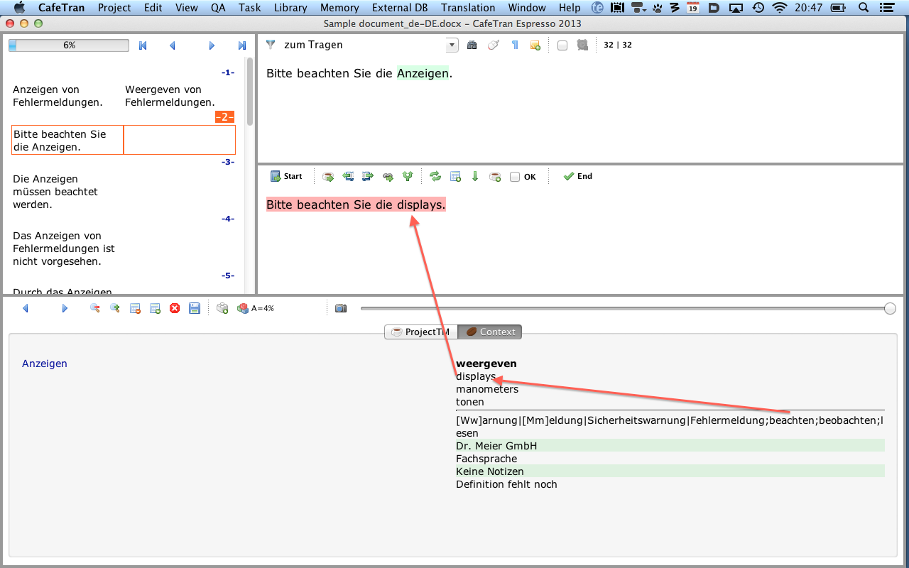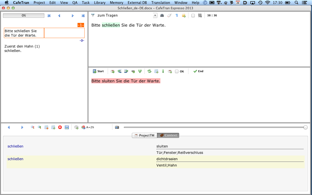 The German verb ‘sichern’ gets different translations (borgen, back-uppen, zekeren, beveiligen/beschermen, …) into Dutch, depending on its meaning. For a CAT tool like CafeTran, there currently is no way to determine the meaning of a word. However, it can determine the context of a word at the surface level. When a word occurs in the context of certain other words (e.g. Schraubverbinding/Bolzen/Schraube, Daten/Datensatz/Diskette, Bergsteiger/Kletterer), this can give a cue about its meaning. So paying attention to a word’s context is a good way to narrow down the possible meanings of a word. This is where CafeTran’s Context-aware Auto-assembling can help you to be more productive.
