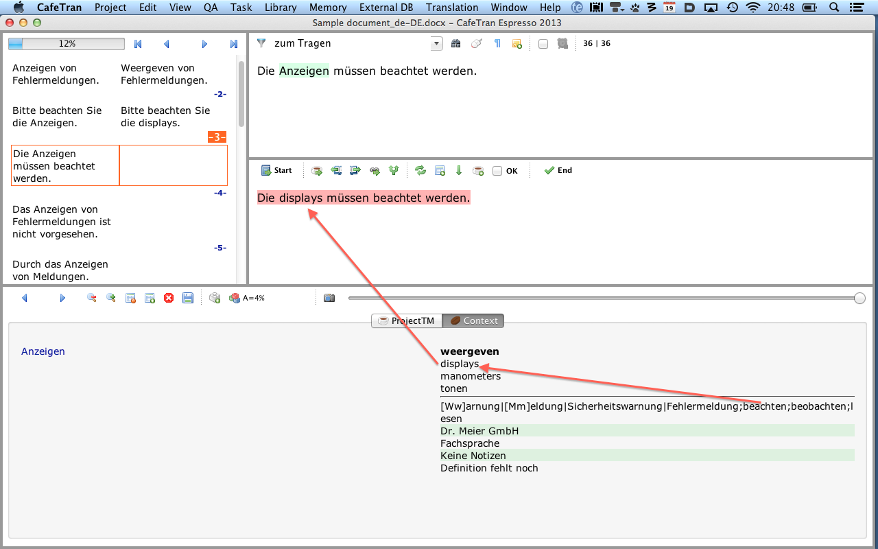 Example 1: The source segment contains 'Fehlermeldungen', which is the plural of 'Fehlermeldung', which is present in the context field as a trigger for the target term 'weergeven'. In other words: since the source segment contains both 'Fehlermeldung' and 'Anzeigen', the target term 'weergeven' is inserted.