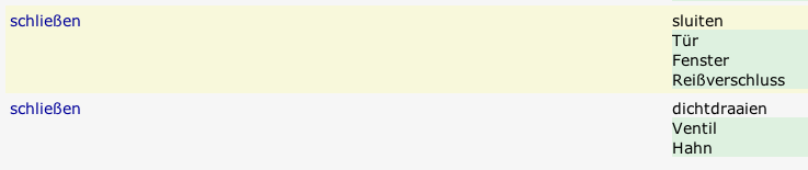 In the two examples below you can see that the correct translation of ‘schließen’ has been auto-assembled, based on the source words ‘Tür’ and ’Hahn’: